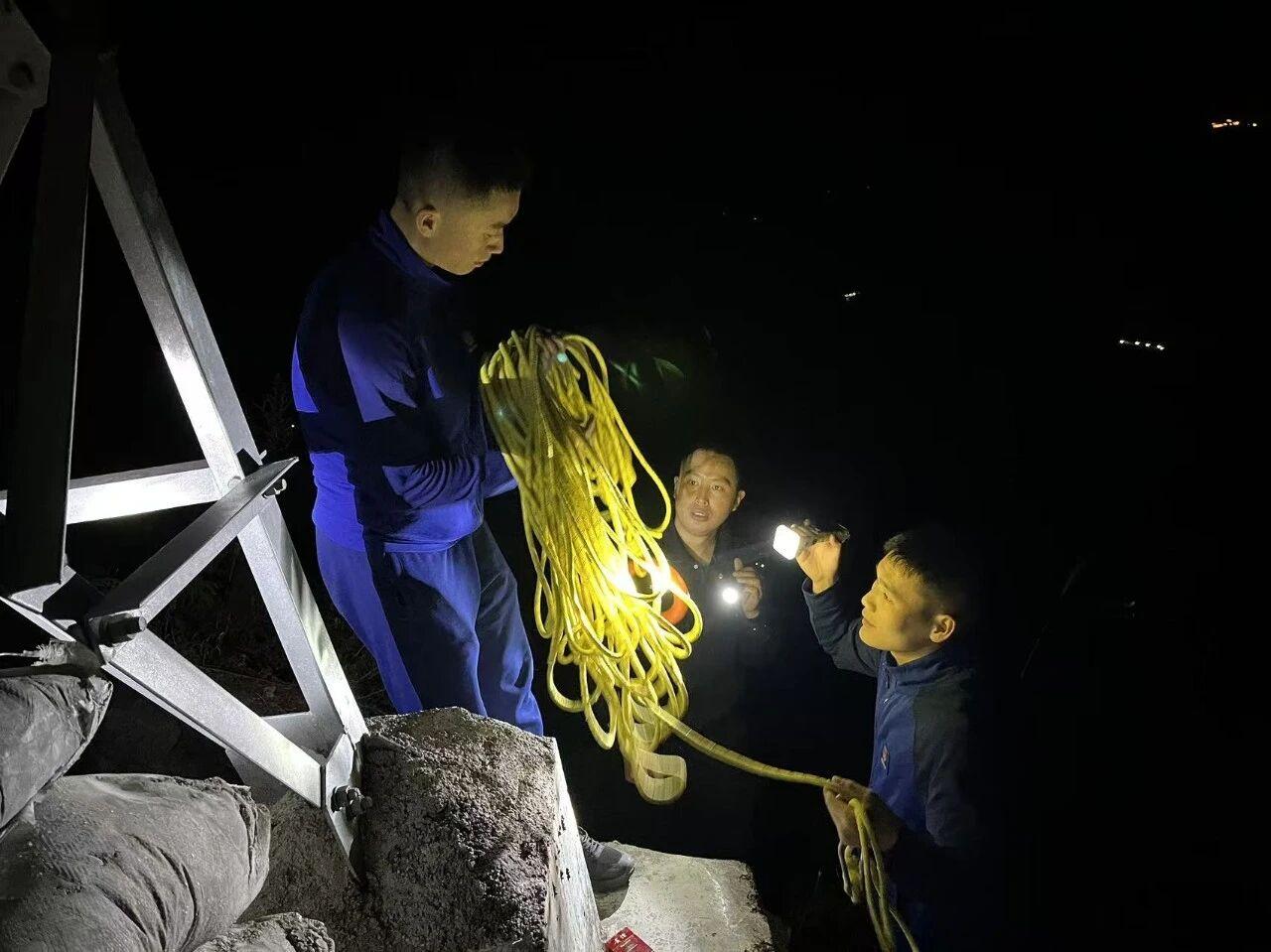 為快速鎖定被困人員位置,救援人員一邊用應(yīng)急手電照射山間,一邊大聲呼喊。在燈光的指引和呼喊的回應(yīng)中,救援組逐步確認(rèn)被困人員位于山頂鐵塔下方一百米處。此處坡度接近80度,近乎垂直,且布滿荊棘,救援難度極大?!吧辽?,再難也要把人救出來!”救援組迅速制定救援方案,民警與消防員相互配合,將救生繩牢牢固定后,沿著陡坡小心翼翼地緩慢下滑。