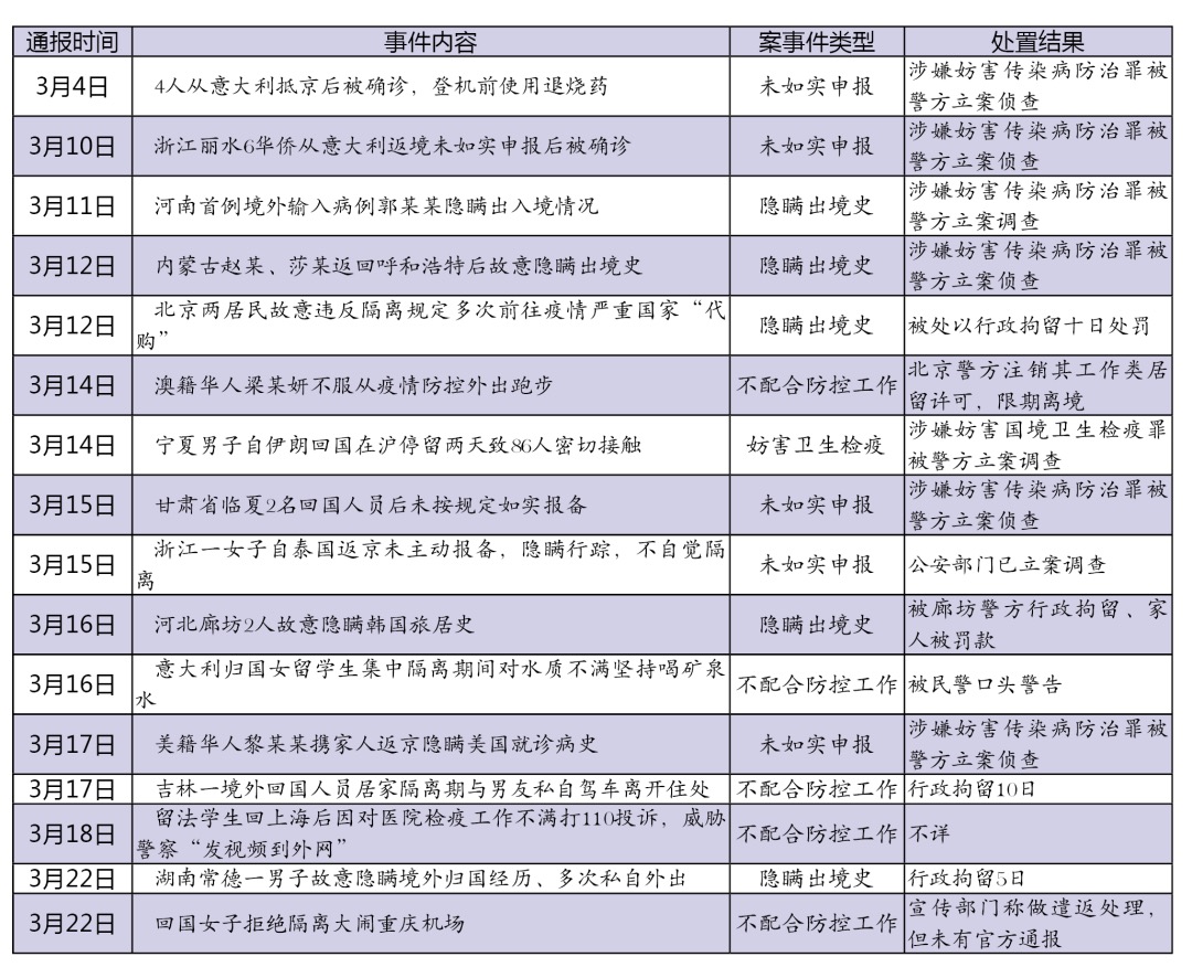 當前,國內(nèi)疫情防控形勢持續(xù)向好,海外疫情卻在加速蔓延,一些境外人員和海外留學生選擇回國避疫,“外防輸入”成現(xiàn)階段疫情防控工作的重中之重。在此關(guān)鍵時期,少數(shù)人員采取各種手段隱瞞出境史或隱瞞病情,不遵守防疫、隔離等規(guī)定,妨害疫情防控秩序,給我國的疫情防控工作帶來巨大壓力,引發(fā)輿論高度關(guān)注。法制網(wǎng)輿情中心(ID:fzwyqzx)選取3月以來熱度較高的16起個案,簡要分析其類型和處置結(jié)果,梳理輿論觀點,并就后續(xù)處置提出應(yīng)對建議。