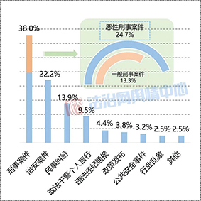 涉法輿情事件158起,占比95.2%。由刑事案件引發(fā)的輿情占比最高,達(dá)38.0%,其中惡性刑事案件占比24.7%,一般刑事案件占比13.3%。治安案件、民事糾紛、違紀(jì)違法通報(bào)引發(fā)的輿情分別占比22.2%、13.9%、4.4%。民事糾紛中,涉及婚姻問題尤其離婚的案事件同比較多,如福建連城縣法院發(fā)出首張“離婚冷靜期通知書”、湖南女子5年4次起訴離婚均被駁回、全國首例家庭勞務(wù)補(bǔ)償案宣判等。政策發(fā)布、公共安全事件引發(fā)的輿情分別占比3.8%、3.2%。此外,教育等行業(yè)亂象波及政法機(jī)關(guān)的輿情占比2.5%,其他輿情事件占比2.5%。
