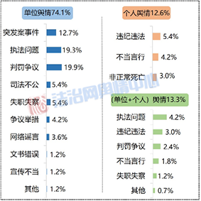 從輿情類型來看,責(zé)任主體分為三個(gè)層面:涉及政法單位的輿情占比74.1%,涉及政法干警個(gè)人的輿情占比12.7%,涉及單位和個(gè)人的復(fù)合輿情占比13.3%。