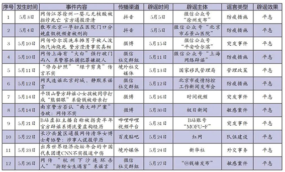 從謠言內(nèi)容來看,5月涉疫謠言仍占多數(shù),但熱度及影響力有所降低,表明網(wǎng)民對謠言的甄別能力顯著提高。值得注意的是,部分涉疫謠言因情節(jié)離奇且具有較強(qiáng)的情緒煽動力,曝出后快速發(fā)酵,如網(wǎng)傳“北京一孕婦在醫(yī)院門口分娩”等謠言。當(dāng)?shù)赜嘘P(guān)部門辟謠及時,有效消除誤會。本月,部分網(wǎng)民針對惡性案件、舊案積案造謠,通過渲染案情、捏造案件調(diào)查進(jìn)展獲得關(guān)注,如編造“杭州下沙連環(huán)殺人”“浙財女生遇害”“‘南大碎尸案’告破”等謠言。所屬地公安機(jī)關(guān)主動澄清謠言,但部分輿論對舊案關(guān)注熱度仍有增無減,輿情多呈現(xiàn)“長尾效應(yīng)”。本月境外媒體惡意造謠、抹黑我國現(xiàn)象較為凸顯,如敵媒編造“停辦護(hù)照”“綠卡剪角”傳言攻擊我國出入境管理措施等。對此,有關(guān)部門嚴(yán)正發(fā)聲,有力回?fù)舨粚崍蟮馈?/p>
