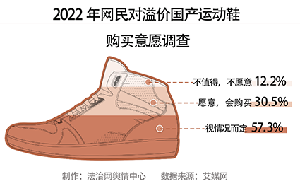從艾媒網(wǎng)公布的數(shù)據(jù)來看,30.5%的消費者表示,無論國產(chǎn)運動鞋溢價多少都愿意購買,57.3%的消費者稱會視溢價情況而定,12.2%的消費者表示不會購買國產(chǎn)溢價運動鞋。