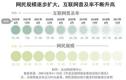 隨著互聯(lián)網(wǎng)的不斷普及,我國(guó)網(wǎng)民規(guī)模持續(xù)增長(zhǎng)。據(jù)41次-50次(2017年12月-2022年6月)《報(bào)告》顯示,截至2022年6月,我國(guó)互聯(lián)網(wǎng)普及率已達(dá)74.4%,較2021年12月提升1.4個(gè)百分點(diǎn),網(wǎng)民規(guī)模達(dá)10.51億。