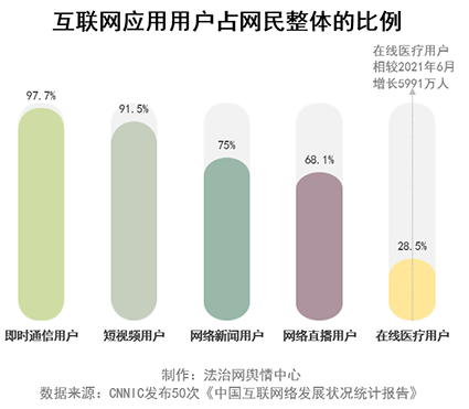 從總體規(guī)模來看,即時(shí)通信用戶規(guī)模達(dá)10.27億,占網(wǎng)民整體的97.7%。短視頻用戶緊隨其后,占網(wǎng)民整體的91.5%。網(wǎng)絡(luò)新聞?dòng)脩粽季W(wǎng)民整體的75.0%。網(wǎng)絡(luò)直播用戶占網(wǎng)民整體的68.1%。在線醫(yī)療用戶占網(wǎng)民整體的28.5%,隨著在線醫(yī)療需求的不斷釋放,在線醫(yī)療行業(yè)呈現(xiàn)出高速發(fā)展態(tài)勢(shì),截至2022年6月,在線醫(yī)療用戶規(guī)模較2021年6月增長(zhǎng)5991萬(wàn)。
