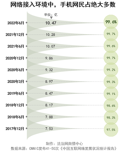 從2017年12月到2022年6月網(wǎng)民規(guī)模對(duì)比數(shù)據(jù)可以看出,我國(guó)網(wǎng)民規(guī)模持續(xù)增長(zhǎng)。2020年12月相較于2020年6月網(wǎng)民增長(zhǎng)數(shù)量更是突破了4900萬(wàn)人。