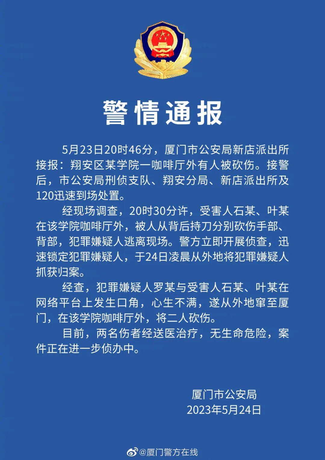 5月24日0時(shí)許,頂端新聞?dòng)浾呗?lián)系到廈門市翔安區(qū)新店派出所及翔安區(qū)公安局,相關(guān)工作人員均表示,警方已經(jīng)介入調(diào)查,后續(xù)會(huì)發(fā)布通報(bào)。當(dāng)日12時(shí)許,“@廈門警方在線”發(fā)布警情通報(bào)稱,5月23日20時(shí)30分許,受害人石某、葉某在某學(xué)院咖啡廳外,被人從背后持刀分別砍傷手部、背部。20時(shí)46分,廈門市公安局新店派出所接報(bào)立即開展偵查,于24日凌晨從外地將犯罪嫌疑人抓獲歸案。經(jīng)查,犯罪嫌疑人羅某與受害人石某、葉某在網(wǎng)絡(luò)平臺(tái)上發(fā)生口角,心生不滿,遂從外地竄至廈門實(shí)施作案。目前,兩名傷者經(jīng)送醫(yī)治療,無(wú)生命危險(xiǎn),案件正在進(jìn)一步偵辦中。