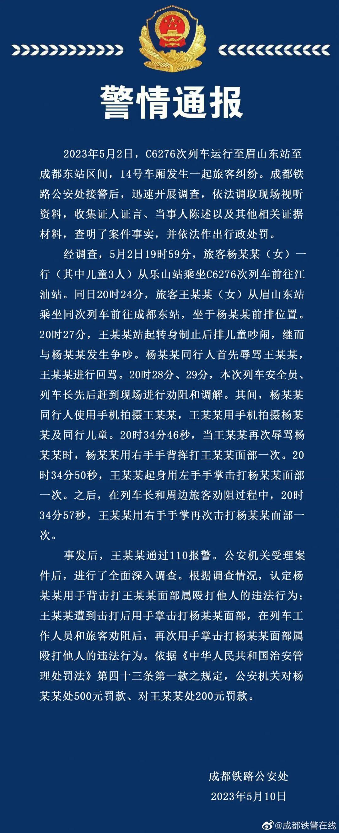 面對(duì)網(wǎng)絡(luò)質(zhì)疑,5月10日,成都鐵路公安處官方微博“@成都鐵警在線”發(fā)布警情通報(bào)稱(chēng),根據(jù)調(diào)查情況,認(rèn)定楊某某用手背擊打王某某面部屬毆打他人的違法行為;王某某遭到擊打后用手掌擊打楊某某面部,在列車(chē)工作人員和旅客勸阻后,再次用手掌擊打楊某某面部屬毆打他人的違法行為。警方據(jù)此認(rèn)為雙方均違反治安管理處罰法,并處以不同金額的罰款。隨后,四川廣播電視臺(tái)“@四川觀察”、封面新聞公布現(xiàn)場(chǎng)視頻,涉及列車(chē)車(chē)廂監(jiān)控、列車(chē)長(zhǎng)巡檢記錄儀、當(dāng)事雙方手機(jī)所拍視頻等多個(gè)角度,直觀地呈現(xiàn)雙方發(fā)生爭(zhēng)執(zhí)繼而爆發(fā)肢體沖突的過(guò)程。網(wǎng)絡(luò)討論熱度再次攀升,微博上形成“#高鐵掌摑事件雙方曾多次對(duì)罵#”“#高鐵被打女子2次打人被認(rèn)定違法#”“#王某某被打后兩次掌摑楊某某#”等多個(gè)話(huà)題,不少網(wǎng)民一改之前支持王某某的立場(chǎng)。但部分網(wǎng)民仍從情感角度出發(fā),質(zhì)疑官方對(duì)視頻進(jìn)行二次剪輯,認(rèn)為警方苛求被打者還擊的間隔時(shí)間有失公平。