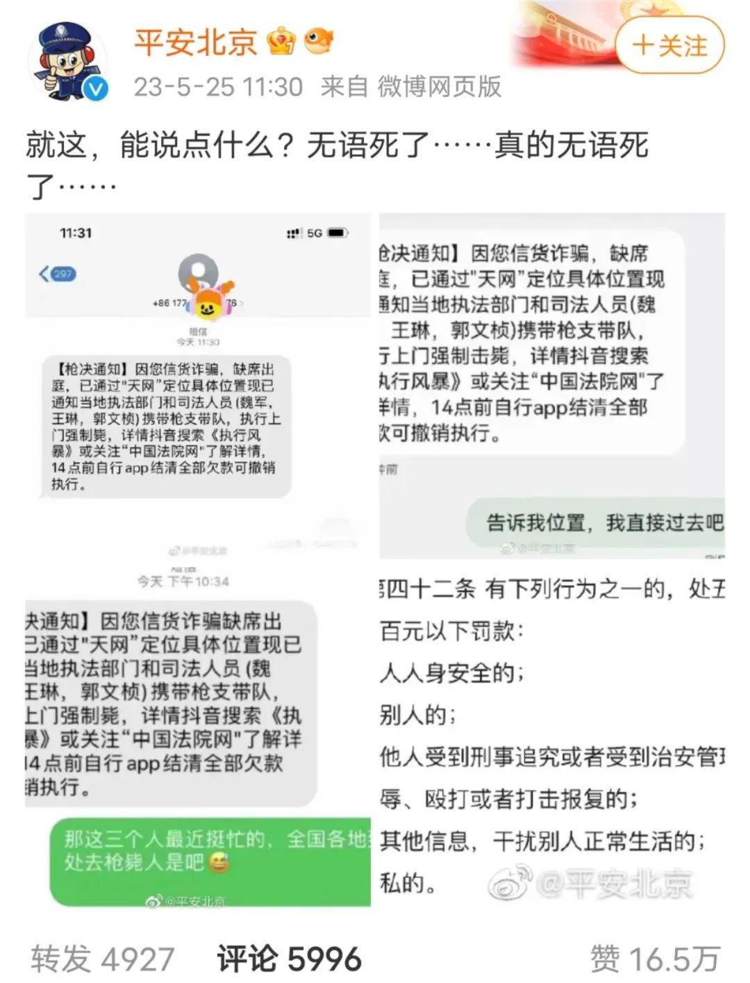 近日,多名網(wǎng)民曬出圖片稱收到“強(qiáng)制槍斃”詐騙短信,引發(fā)一小波關(guān)注。5月25日11時(shí)許,北京市公安局官方微博“@平安北京”發(fā)布一則為幾張?jiān)p騙短信截圖的微博,圖片內(nèi)容相同皆寫著:“因您信貸詐騙,缺席出庭,已通過‘天網(wǎng)’定位具體位置,現(xiàn)已通知當(dāng)?shù)貓?zhí)法部門和司法人員(魏軍,王琳,郭文禎)攜帶槍支帶隊(duì),執(zhí)行上門強(qiáng)制槍斃,詳情抖音搜索《執(zhí)行風(fēng)暴》或關(guān)注‘中國(guó)法院網(wǎng)’了解詳情,14點(diǎn)前自行app結(jié)清全部欠款可撤銷執(zhí)行?!睂?duì)此,“@平安北京”直言道“就這,能說點(diǎn)什么?真的無語死了”。隨后,還配了治安管理處罰法的截圖,指出發(fā)短信恐嚇?biāo)怂媾R的處罰。該則微博迅速引發(fā)大量網(wǎng)民圍觀,相關(guān)微博轉(zhuǎn)評(píng)超過1.1萬次,點(diǎn)贊16.5萬次。多數(shù)網(wǎng)民表示騙子侮辱人智商,并留言調(diào)侃稱“笑死,現(xiàn)在槍決都能上門服務(wù)了”“這三個(gè)人挺忙,全國(guó)各地到處去槍斃人”。