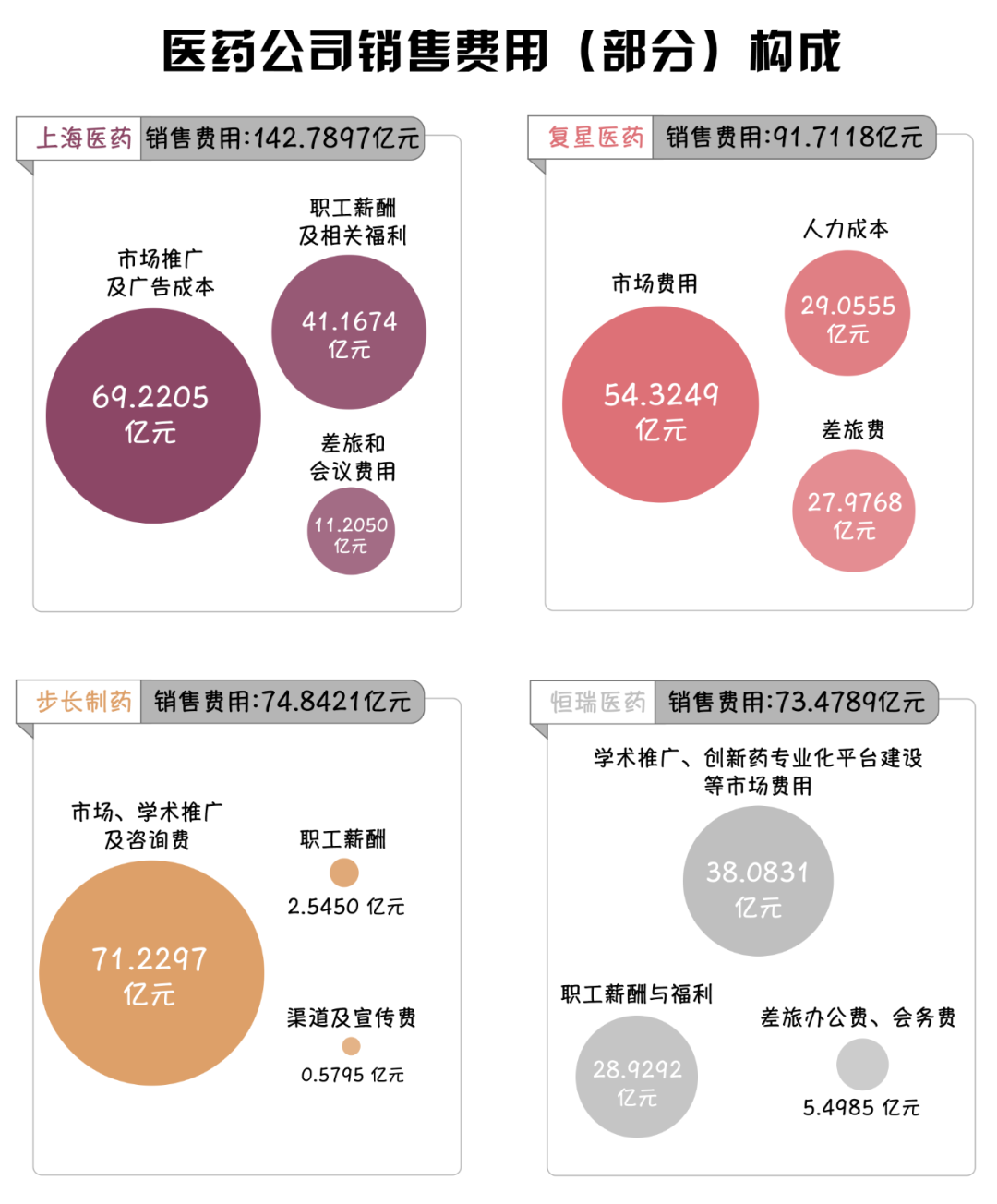 從藥企的銷售費(fèi)用構(gòu)成來看,分析2022年行業(yè)內(nèi)銷售費(fèi)用前4名的藥企可以看出,銷售費(fèi)用多用于市場(chǎng)、學(xué)術(shù)推廣、職工薪酬及福利。