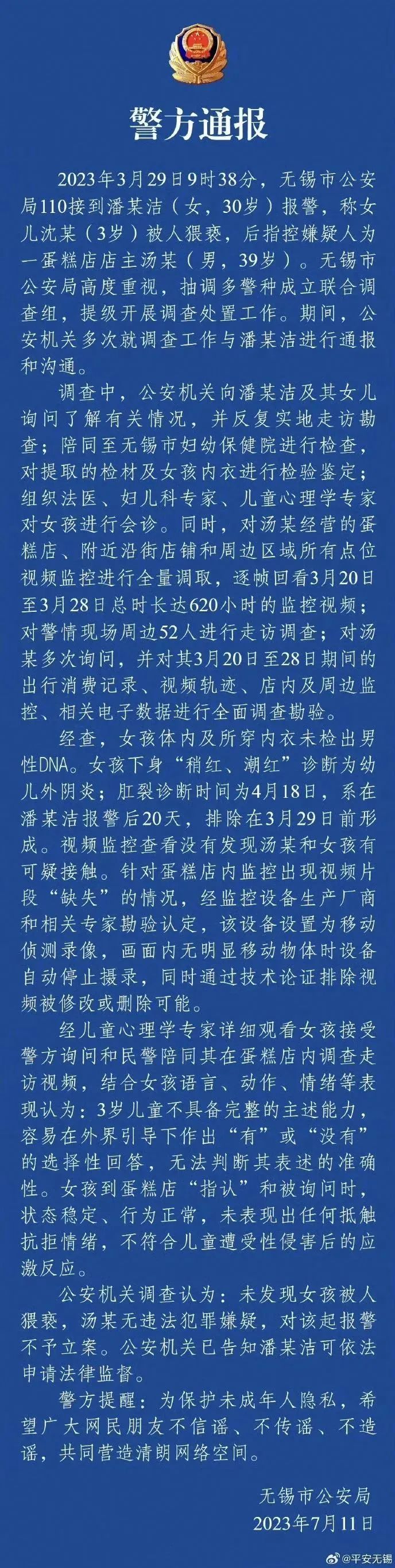 面對巨大的輿情壓力,7月11日,無錫市公安局發(fā)布通報,詳述調(diào)查過程,包括DNA檢測、肛裂原因排除、視頻監(jiān)控核查、心理學(xué)家判定等內(nèi)容。通報全文800余字,邏輯清晰、內(nèi)容詳實(shí),“不存在猥褻行為”這一結(jié)論獲得輿論認(rèn)可,“#警方通報無錫3歲女童事件調(diào)查結(jié)果#”等微博話題閱讀量累計近6億。至此,輿情反轉(zhuǎn),多數(shù)網(wǎng)民指責(zé)潘某潔虛構(gòu)事實(shí)、利用女兒造謠污蔑,呼吁依法對其嚴(yán)懲。