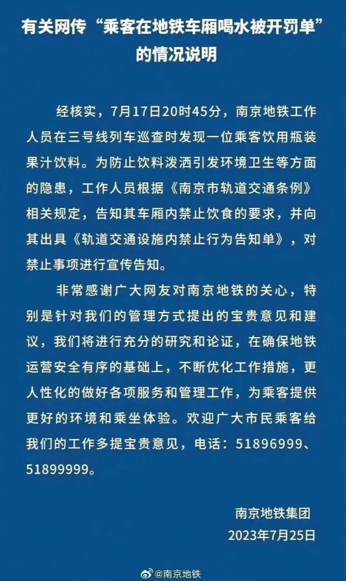 當(dāng)日18時(shí)許,南京地鐵在其官方微博發(fā)布《有關(guān)網(wǎng)傳“乘客在地鐵車(chē)廂喝水被開(kāi)罰單”的情況說(shuō)明》,文中稱(chēng),工作人員在列車(chē)巡查時(shí)發(fā)現(xiàn)一位乘客飲用瓶裝果汁飲料,為防止飲料潑灑引發(fā)環(huán)境衛(wèi)生等方面的隱患,工作人員根據(jù)相關(guān)規(guī)定,向其出具《軌道交通設(shè)施內(nèi)禁止行為告知單》,對(duì)禁止事項(xiàng)進(jìn)行宣傳告知。南京地鐵還表示,將“不斷優(yōu)化工作措施,更人性化地做好各項(xiàng)服務(wù)和管理工作”。