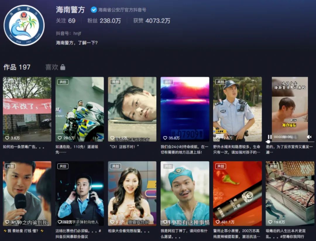 豐富的傳播渠道和多樣的共創(chuàng)模式可以說是“海南警方”短視頻成功破圈的基礎。在傳播渠道方面,“海南警方”拍攝的短視頻會依據(jù)內容形式,首先投放在抖音、快手以及微信視頻號等平臺,通過擴充社交媒體傳播渠道,最大范圍內汲取公域流量,打好用戶底盤。除了以短視頻平臺為核心的投放策略外,“海南警方”還利用其他平臺作為引流渠道,如以日常工作宣傳為主的今日頭條和微博上,“海南警方”發(fā)布對應的視頻合集,嘗試突破平臺壁壘,最大程度吸引網(wǎng)民注意力。在創(chuàng)作方式上,“海南警方”根據(jù)視頻內容與其他賬號合作,如《這錢不對》和《禁毒版盜夢空間》兩部作品,由于涉及反邪教和禁毒題材,“海南警方”分別與中國反邪教和海南禁毒合作拍攝,這種基于宣傳主旨達成的合作模式可以幫助賬號有效拓展分眾渠道,觸達更多用戶?!昂D暇健边€有部分視頻是與下級公安的合作,包括昌江警方、澄邁警方等,這一方面可以發(fā)揮海南警方的虹吸效應,聚合更多流量助推宣傳效果,另一方面也可以反哺弱勢賬號,打造傳播矩陣,為普法宣傳開辟更多通路。