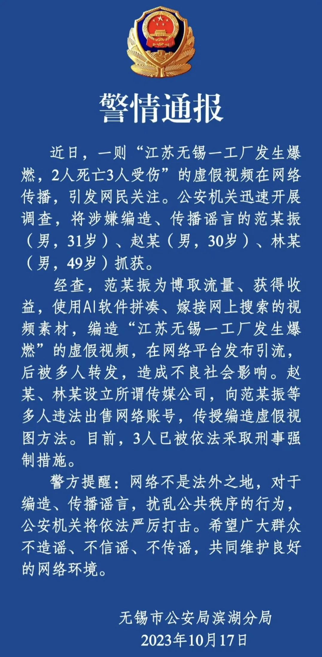 【典型案例】10月17日,一則“江蘇無(wú)錫一工廠發(fā)生爆燃,2人死亡3人受傷”的虛假視頻在網(wǎng)絡(luò)傳播,引發(fā)網(wǎng)民關(guān)注。當(dāng)日20時(shí)許,無(wú)錫市公安局濱湖分局微信公眾號(hào)“濱湖警事”發(fā)布警情通報(bào),稱此為一起謠言事件,已經(jīng)將造謠、傳謠的范某、趙某、林某三人抓獲。經(jīng)查,范某為博取流量、獲得收益,使用AI軟件拼湊、嫁接網(wǎng)上搜索的視頻素材,編造相關(guān)虛假視頻,在網(wǎng)絡(luò)平臺(tái)發(fā)布引流,后被多人轉(zhuǎn)發(fā),造成不良社會(huì)影響。趙某、林某設(shè)立所謂傳媒公司,向范某等多人違法出售網(wǎng)絡(luò)賬號(hào),傳授編造虛假視圖方法。