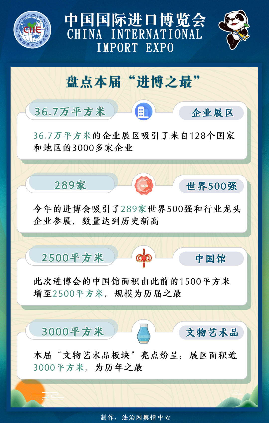 第六屆進(jìn)博會(huì)將創(chuàng)造多個(gè)“歷史之最”:今年進(jìn)博會(huì)企業(yè)展的展覽面積達(dá)到36.7萬平方米,吸引了128個(gè)國家和地區(qū)的3000多家企業(yè),規(guī)模為歷史之最;289家世界500強(qiáng)和行業(yè)龍頭企業(yè)參展,數(shù)量達(dá)到歷史新高;中國館升級(jí)擴(kuò)容,展覽面積由此前的1500平方米增至2500平方米,規(guī)模為歷屆之最;“文物藝術(shù)品板塊”的展區(qū)面積逾3000平方米,為歷屆之最。