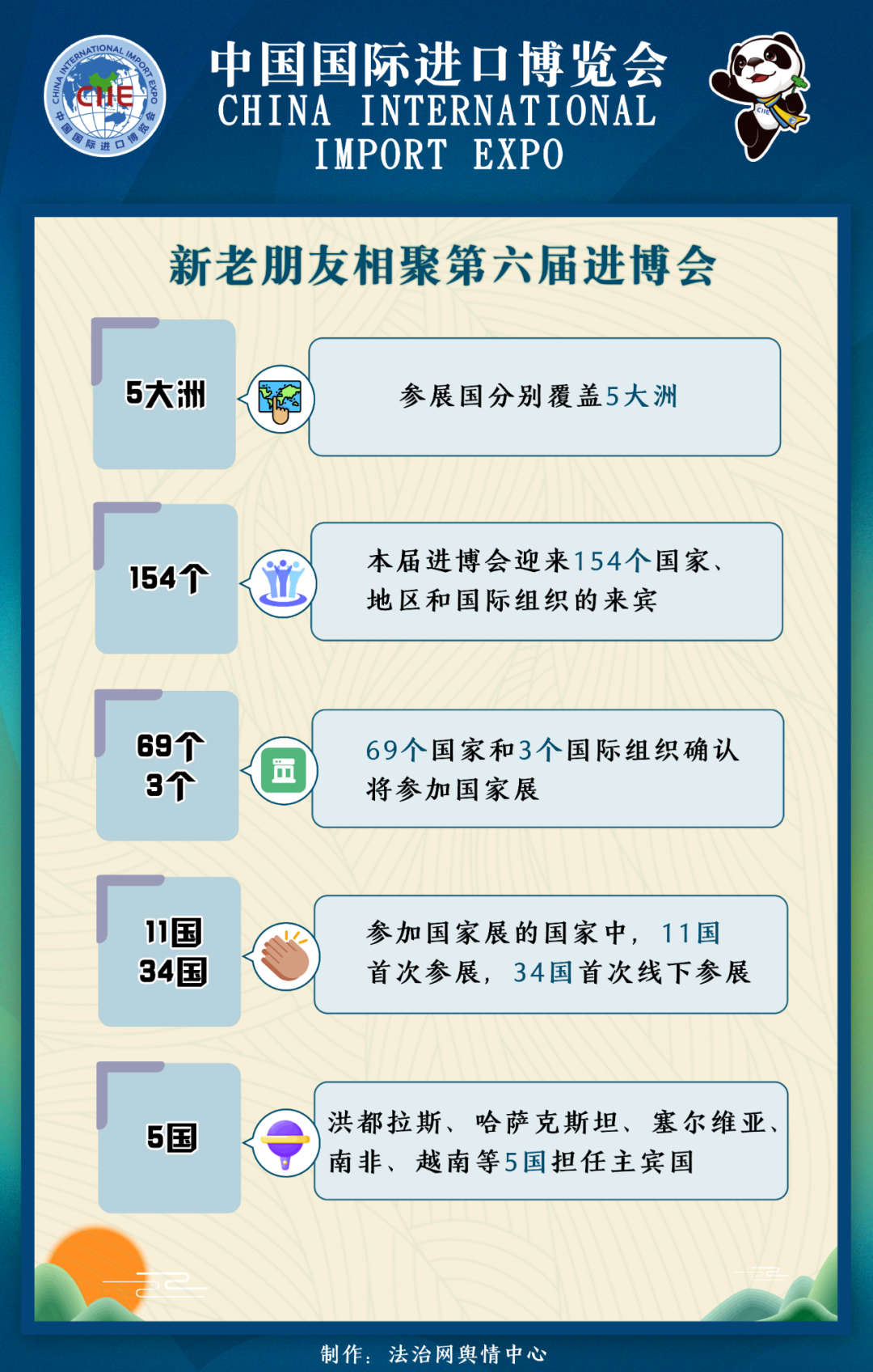 本屆進(jìn)博會(huì)將迎來154個(gè)國家、地區(qū)和國際組織的來賓。其中國家展的參展國別覆蓋五個(gè)大洲。69個(gè)國家和3個(gè)國際組織確認(rèn)將參加國家展。其中,11國首次參展,34國首次線下參展,洪都拉斯、哈薩克斯坦、塞爾維亞、南非、越南等5國擔(dān)任主賓國。