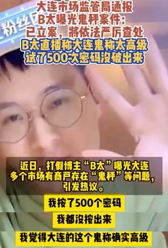 11月9日,“B太”發(fā)布實(shí)測海鮮加工餐廳的視頻,稱其到訪的3家海鮮加工商家均疑似在秤上做了手腳?!癇太”嘗試破解商家使用的“鬼秤”密碼時(shí),被商家推搡,還遭威脅“把眼鏡給你砸了”;其撥打市場監(jiān)管局電話后,等待一個(gè)半小時(shí)仍無人到場,直到“B太”開啟直播,工作人員才姍姍來遲。“B太”出示相關(guān)視頻證據(jù),經(jīng)檢查該商家的電子秤雖然有強(qiáng)檢合格證,但沒有鉛封。而當(dāng)“鬼秤”被帶到市場監(jiān)管局時(shí),專業(yè)檢測人員只對“問題電子秤”進(jìn)行簡單檢測后就宣布該秤“無問題”。當(dāng)“B太”提出對電子秤進(jìn)行密碼破譯時(shí),檢測人員表示“我也跟著學(xué)習(xí)學(xué)習(xí)”,但“B太”嘗試了500多個(gè)密碼都未破解成功。次日,該電子秤被送往無錫檢測?!癇太”在微博和抖音平臺發(fā)布相關(guān)視頻,播放量迅速破億次,多數(shù)網(wǎng)民指責(zé)店家有恃無恐,質(zhì)疑市場監(jiān)管部門消極怠工;部分計(jì)劃去大連旅游的網(wǎng)民還表示,因擔(dān)心被“坑”將臨時(shí)改變目的地。