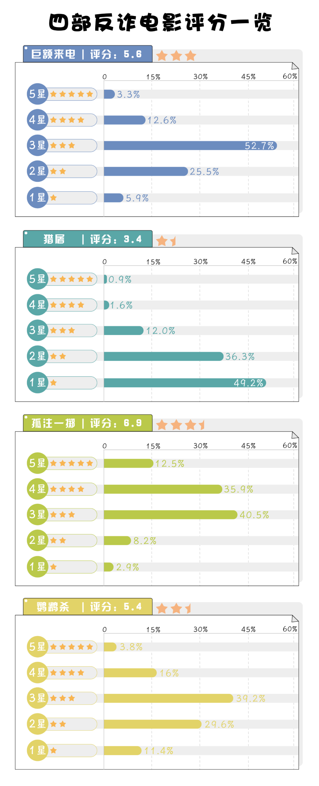 據(jù)豆瓣用戶對四部電影的評分,截至2024年2月1日,《孤注一擲》以總得分6.9位居四部電影之首,其余三部均在6分以下。分析評分構成發(fā)現(xiàn),給出“三星”的網(wǎng)民不在少數(shù),“中規(guī)中矩”似乎成為了反電詐電影的標簽。