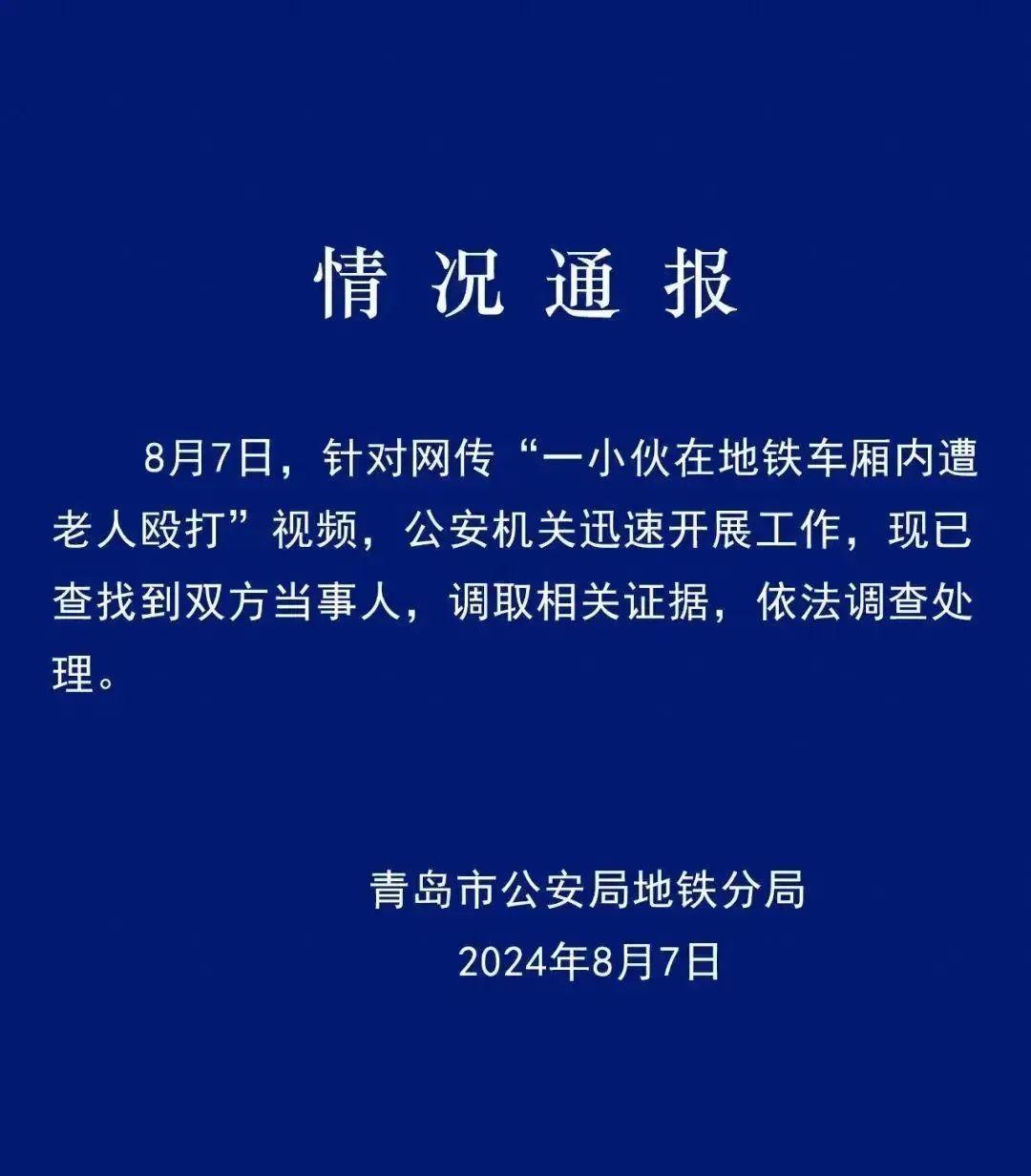 8月9日,微信公眾號“青島地鐵公安”再發(fā)通報詳述案情。通報稱,8月7日,和某城(男,23歲,無業(yè))乘坐地鐵期間對周圍多名乘客進行言語滋擾,在對翟某緒(男,69歲,退休職工)進行滋擾辱罵后,雙方發(fā)生肢體沖突,過程中和某城扯破翟某緒上衣,翟某緒擊打和某城面部。公安機關依法對和某城處以行政拘留處罰,翟某緒毆打和某城致其鼻骨粉碎性骨折,傷情損傷程度為輕傷二級,涉嫌故意傷害罪,依法對其采取刑事強制措施,案件正在進一步辦理中。
