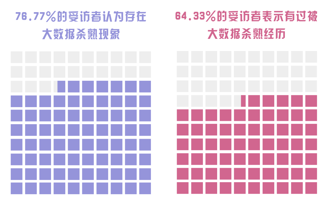大數(shù)據(jù)殺熟本質(zhì)上是算法的濫用,商家利用消費者的信任以及信息不對稱獲取超額利益,侵害消費者權(quán)益。北京市消協(xié)發(fā)布大數(shù)據(jù)殺熟問題調(diào)查報告顯示,七成多(76.77%)受訪者認為存在大數(shù)據(jù)“殺熟”現(xiàn)象,超六成(64.33%)受訪者表示有過被大數(shù)據(jù)殺熟經(jīng)歷。