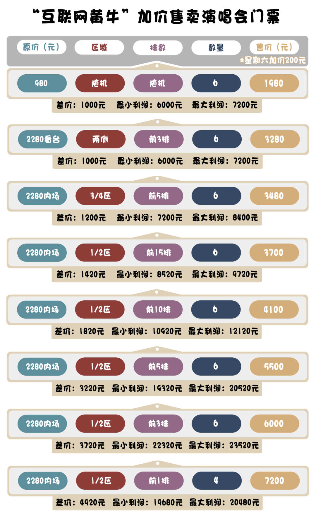 盡管如此,對于背后有二級資源的“互聯(lián)網(wǎng)黃?!眮碚f,售賣“黃?!逼辈⒉皇请y事。以某位在廣東地區(qū)深受歡迎的歌手為例,其預計在今年11月舉行多場個人演唱會,但有粉絲表示,演唱會的門票仍“一秒售罄”。某二手置物平臺數(shù)據(jù)顯示,演唱會門票并非全部售空,部分門票流入“互聯(lián)網(wǎng)黃?!敝?,原價為2280元的內(nèi)場票,因位置不同被炒至3280元至7200元不等。此外,若趕上演唱會在星期六舉辦,買家還需要額外支付200元的“熱門時段搶票費用”。面對“一人一證”的入場機制,“互聯(lián)網(wǎng)黃?!钡纳馑坪醪⑽词艿接绊憽?/span>