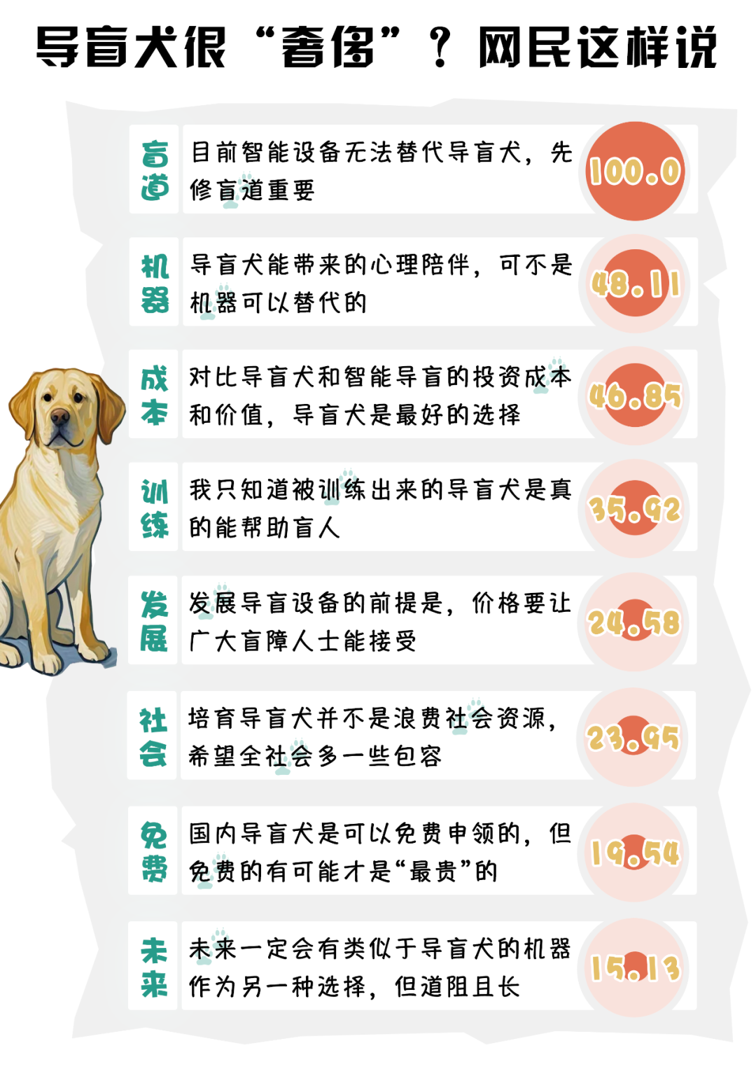 數(shù)據(jù)顯示,培訓(xùn)一條導(dǎo)盲犬的成本約20萬元,有人戲稱其是“奢侈品”。其實(shí),導(dǎo)盲犬是免費(fèi)給視障人士使用的,其養(yǎng)護(hù)、醫(yī)療等成本與寵物犬相差并不大。輿論場(chǎng)中,網(wǎng)民對(duì)于導(dǎo)盲犬的價(jià)值討論呈現(xiàn)截然不同看法。