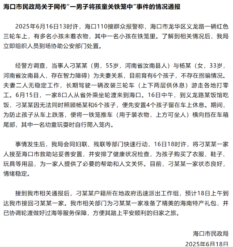 6月18日凌晨,據微信公眾號“海口發(fā)布”消息,海口市民政局通報稱,河南汝南縣人刁某某與有智力障礙的妻子楊某育有6子,無拐騙;夫妻二人無穩(wěn)定工作,長期駕駛一輛改裝三輪車游走各地打零工;因無力看管,刁某某把鐵籠擋在車尾防跌落,幼童玩耍時自行爬入。刁某某一家人已被接至救助站安置,18日將被戶籍地政府工作組接回。另據福建電視臺“第一幫幫團”欄目消息,汝南縣婦聯(lián)回應稱,雙方已結婚多年,各部門正在協(xié)調制定方案,會對孩子幫扶。官方的積極回應和作為緩和網民情緒,輿論關注轉到未成年人權益保障方面,湖北經視《經視直播》欄目關注孩童的受教育權、生命健康權是否得到保障,認為當地部門有必要介入評估這對父母是否具有撫育能力,視情干預;部分網民希望地方政府完善救助體系,保障幼童合法權益。截至6月26日12時,相關信息5.2萬余條,“#??诙嗝嗦阌淄桓赣H關車斗鐵籠#”等微博話題閱讀量累計超1.1億。