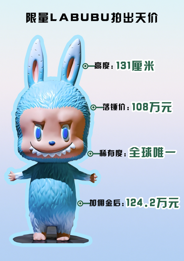 2025年6月10日,一件高131厘米的薄荷色初代LABUBU,以108萬元的價(jià)格落槌成交,創(chuàng)造了最貴LABUBU紀(jì)錄。