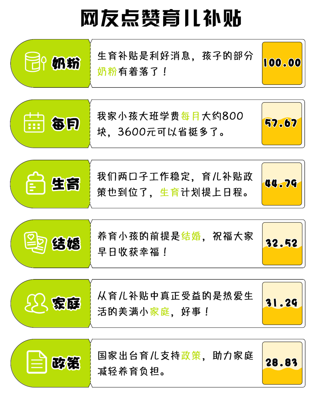 對相關(guān)輿論進(jìn)行分析發(fā)現(xiàn),有網(wǎng)民認(rèn)為,國家出臺育兒補(bǔ)貼相關(guān)政策,在一定程度上幫助了有娃家庭減輕養(yǎng)育負(fù)擔(dān)。有網(wǎng)民從實(shí)際生活出發(fā),表示3600元可以幫助其解決日常養(yǎng)娃部分開銷,例如孩子上幼兒園的部分費(fèi)用、奶粉錢等。未婚未育或者已婚未育的群體也表示,國家出臺的政策和福利定會對生育起到正向推動作用。對于年輕人來說,找到一份穩(wěn)定的工作、開啟一段幸福的婚姻、享受國家的福利政策保障,正是他們所期許的。
