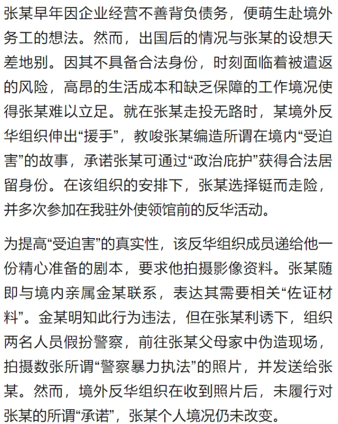 4. “境外反華組織教唆擺拍暴力執(zhí)法” 案。8月14日,國家安全部公布一起標(biāo)題為《跨境賣慘終成空》的案例。據(jù)悉,張某國內(nèi)企業(yè)經(jīng)營不善負(fù)債,赴境外務(wù)工后因無合法身份面臨遣返風(fēng)險(xiǎn)。境外反華組織以“政治庇護(hù)換取居留身份”為誘餌,提供詳細(xì)拍攝劇本,還提出“畫面暴力血腥”“效果要慘”“抓拍增強(qiáng)真實(shí)感”等要求。在反華組織教唆下,張某聯(lián)系到親屬金某,金某明知此行為違法,但在張某利誘下組織兩名人員假扮警察,前往張某父母家中偽造現(xiàn)場(chǎng),拍攝數(shù)張所謂“警察暴力執(zhí)法”的照片,并將材料發(fā)送境外,但境外反華組織在收到照片后未履行對(duì)張某的所謂“承諾”。該案最終被國家安全機(jī)關(guān)破獲。央視網(wǎng)、微信公眾號(hào)“俠客島”等轉(zhuǎn)發(fā)相關(guān)內(nèi)容。輿論將此案稱為一場(chǎng)“政治避難”鬧劇,指出“因一己之利參加境外反華活動(dòng),為反華勢(shì)力提供煽宣‘彈藥’,但最終竹籃打水一場(chǎng)空”。