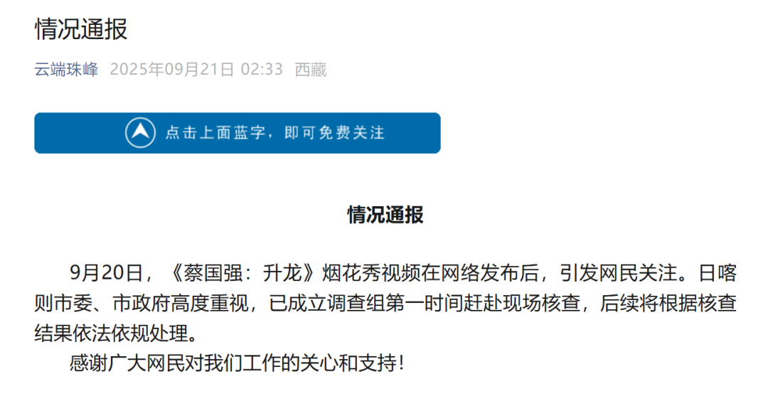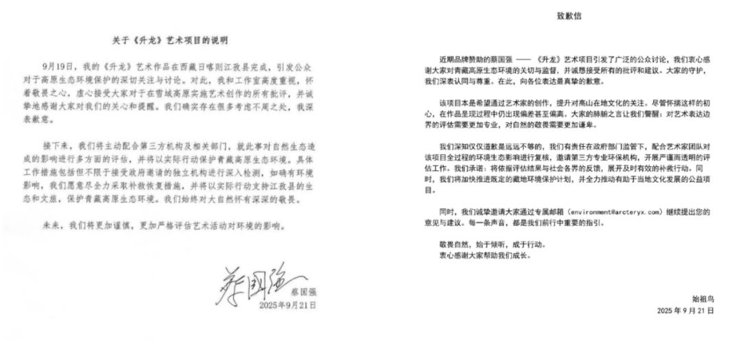 21日凌晨,日喀則市互聯(lián)網(wǎng)信息辦公室發(fā)布情況通報(bào)稱,日喀則市委、市政府已成立調(diào)查組第一時(shí)間趕赴現(xiàn)場(chǎng)核查,后續(xù)將根據(jù)核查結(jié)果依法依規(guī)處理。當(dāng)日,蔡國(guó)強(qiáng)工作室、始祖鳥分別發(fā)布致歉說明,蔡國(guó)強(qiáng)表示將“盡全力采取補(bǔ)救恢復(fù)措施”,始祖鳥則稱將邀第三方評(píng)估并依結(jié)果補(bǔ)救,同時(shí)推進(jìn)藏地環(huán)保計(jì)劃與文化公益項(xiàng)目。