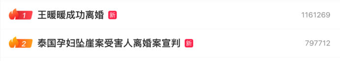 截至10月12日20時(shí),全網(wǎng)信息總量12萬(wàn)余條,“#王暖暖獲離婚賠償50萬(wàn)#”“#泰國(guó)孕婦墜崖案受害人離婚案宣判#”“#王暖暖成功離婚#”等全平臺(tái)相關(guān)話題閱讀量累計(jì)14.6億次。