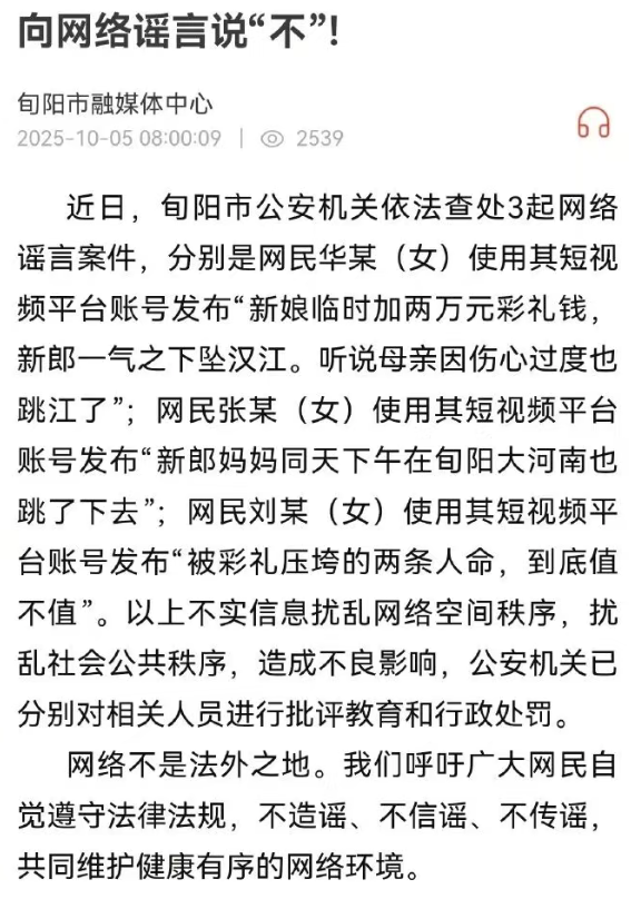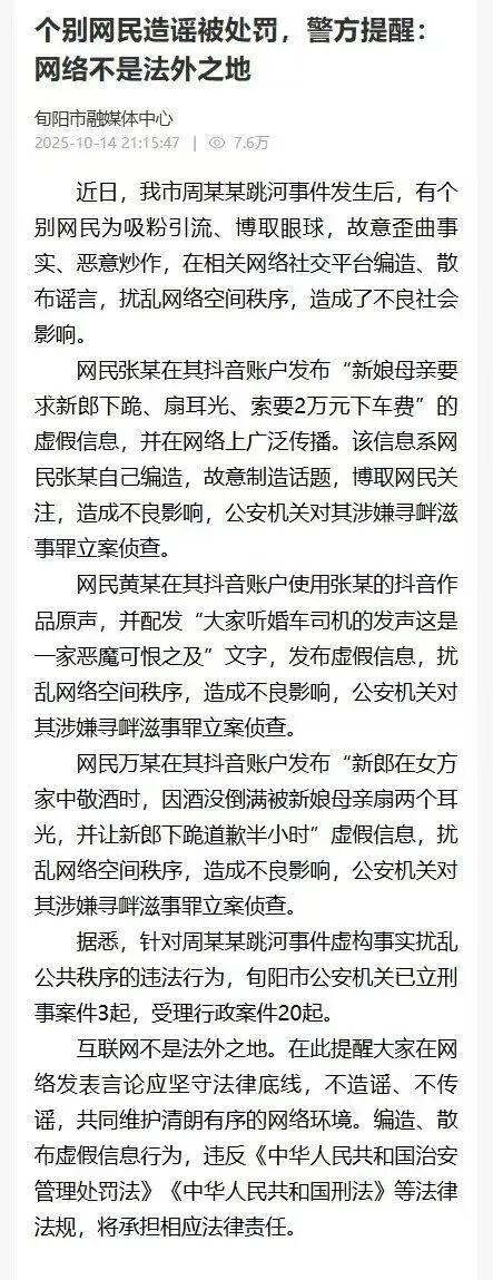 同日,陜西安康旬陽市融媒體中心發(fā)布消息稱,近日,旬陽市周某某跳河事件發(fā)生后,有個別網(wǎng)民為吸粉引流、博取眼球,故意歪曲事實、惡意炒作,在相關網(wǎng)絡社交平臺編造、散布謠言,擾亂網(wǎng)絡空間秩序,造成了不良社會影響。網(wǎng)民張某、黃某、萬某在短視頻賬戶發(fā)布相關虛假信息,造成不良影響,已被公安機關以涉嫌尋釁滋事罪立案偵查。針對周某某跳河事件虛構事實擾亂公共秩序的違法行為,旬陽市公安機關已立刑事案件3起,受理行政案件20起。輿論普遍表示,官方展現(xiàn)了治理謠言的決心,認為制止謠言最好的方法就是公布調(diào)查結果。
