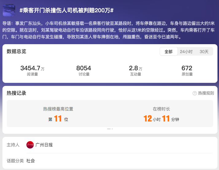 此案被報(bào)道后,環(huán)球網(wǎng)、上觀新聞、《廣州日?qǐng)?bào)》等媒體接力傳播,推高輿情熱度,微博話題“#乘客開門殺撞傷人司機(jī)被判賠200萬#”登上熱搜榜第11位。