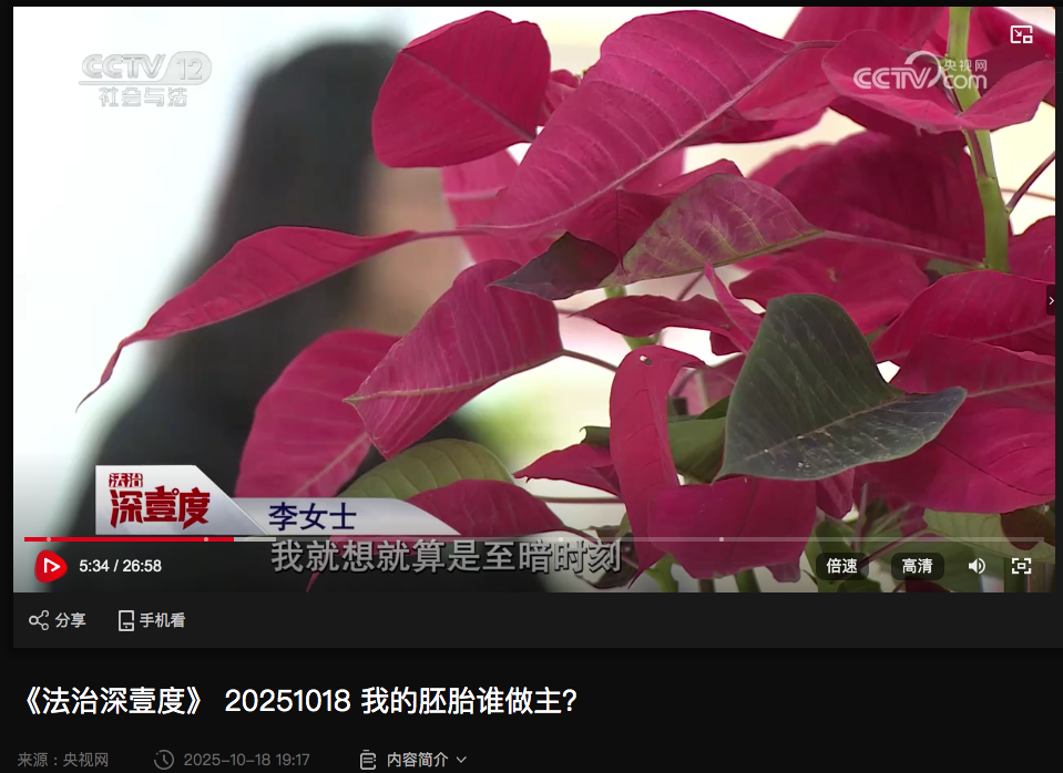 10月18日,央視社會與法頻道《法治深壹度》節(jié)目播發(fā)專題報道《我的胚胎誰做主?》,報道一起喪偶婦女輔助生殖權(quán)益案。據(jù)介紹,福建李女士在丈夫不幸去世后,希望利用夫妻二人在醫(yī)院冷凍保存的胚胎繼續(xù)實(shí)施移植手術(shù),但醫(yī)院鑒于醫(yī)學(xué)倫理問題拒絕了她的請求。隨后李女士將醫(yī)院起訴至法院,一審和二審均被駁回。直至2022年6月,福建省高級人民法院再審認(rèn)為,李女士要求醫(yī)院為其實(shí)施胚胎移植手術(shù)生育二胎有充分的法律依據(jù),并且還能在精神上撫慰雙方的老人,最終判決醫(yī)院繼續(xù)履行合同,為李女士實(shí)施胚胎移植手術(shù)。該報道采訪到李女士本人、醫(yī)院代理律師、法學(xué)專家及法官,全面回顧李女士個人遭遇、情感動機(jī)以及案件背后的法理爭議。