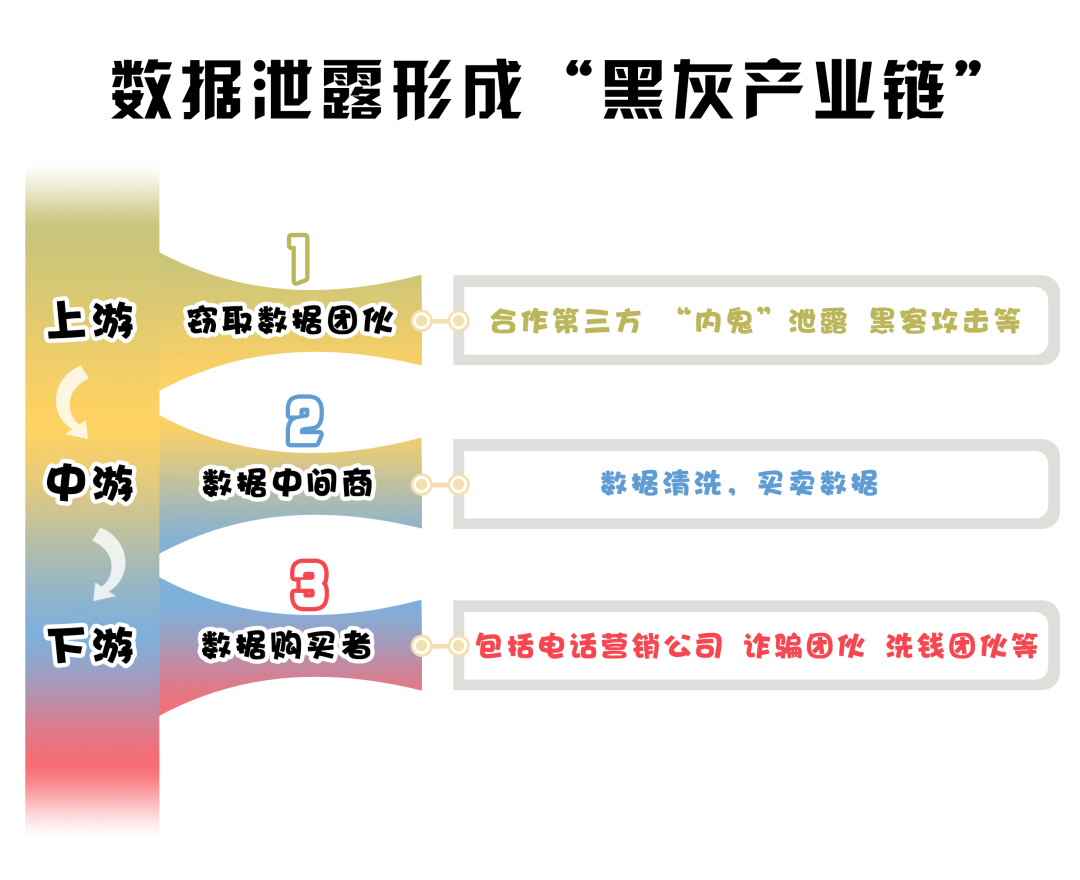 在個(gè)人信息“黑灰產(chǎn)市場”中,上、中、下游分工明確、緊密配合,構(gòu)成完整犯罪鏈條。首先,竊取數(shù)據(jù)團(tuán)伙作為上游“供貨商”,通過與第三方及內(nèi)部人員合作、使用黑客技術(shù)等方式拿到原始數(shù)據(jù)。其次,處于中游的“數(shù)據(jù)中間商”承接上游“供貨商”提供的原始數(shù)據(jù),并對(duì)其進(jìn)行清洗,同時(shí)尋找電話營銷公司、詐騙團(tuán)伙等下游“買家”。最后,下游“買家”會(huì)將清洗后的數(shù)據(jù)轉(zhuǎn)化為非法獲利的工具,通過定向?qū)嵤┻`法犯罪行為達(dá)到斂財(cái)目的,由此實(shí)現(xiàn)犯罪鏈條規(guī)模化、專業(yè)化的閉環(huán)。