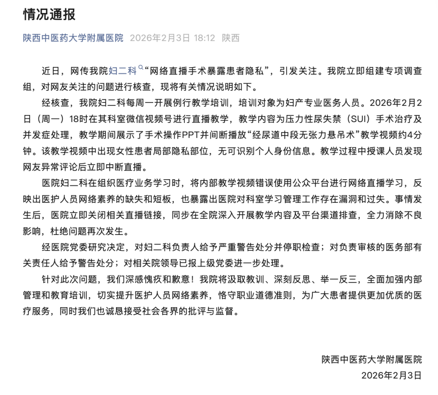 我院婦二科每周一開展例行教學(xué)培訓(xùn),培訓(xùn)對(duì)象為婦產(chǎn)專業(yè)醫(yī)務(wù)人員。2月2日18時(shí)其科室微信視頻號(hào)進(jìn)行直播教學(xué),視頻中出現(xiàn)女性患者局部隱私部位,無可識(shí)別個(gè)人身份信息。教學(xué)過程中授課人員發(fā)現(xiàn)網(wǎng)民異常評(píng)論后立即中斷直播??剖覍?nèi)部教學(xué)視頻用于公眾平臺(tái)直播,暴露醫(yī)護(hù)人員網(wǎng)絡(luò)素養(yǎng)不足及醫(yī)院管理漏洞。醫(yī)院已關(guān)閉直播鏈接、開展全院排查,并對(duì)婦二科負(fù)責(zé)人給予嚴(yán)重警告及停職檢查處分,對(duì)醫(yī)務(wù)部相關(guān)責(zé)任人給予警告處分,相關(guān)院領(lǐng)導(dǎo)已報(bào)上級(jí)黨委處理。醫(yī)院對(duì)此深表愧疚歉意,承諾將汲取教訓(xùn)、加強(qiáng)管理,提升醫(yī)護(hù)人員素養(yǎng),誠(chéng)懇接受社會(huì)監(jiān)督。
