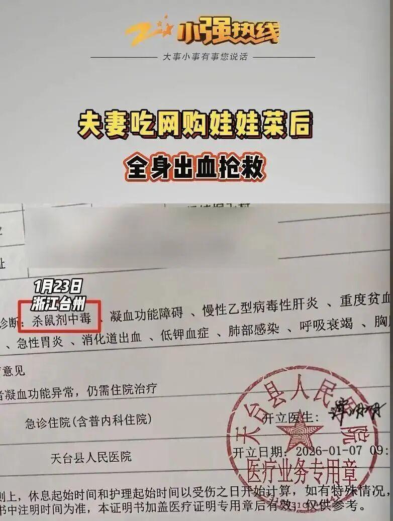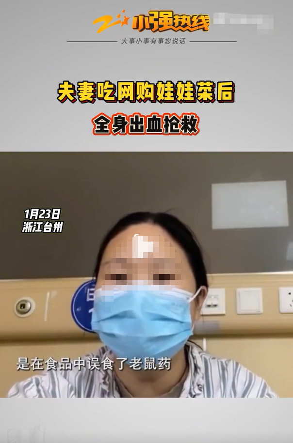 1月23日,浙江衛(wèi)視科教頻道小強熱線節(jié)目報道稱,浙江臺州天臺縣楊女士和丈夫于2025年12月網(wǎng)購娃娃菜,食用后夫婦倆同時出現(xiàn)全身出血癥狀,入院搶救。醫(yī)院診斷結(jié)果顯示,夫婦倆均為老鼠藥中毒。1月12日,夫婦倆選擇報警。警方檢測了楊女士家中物品,從娃娃菜中檢測出了老鼠藥。隨后,天臺縣公安局受理了楊女士夫婦報稱的“森逸軒花卉園藝生產(chǎn)、銷售有毒、有害食品案”。