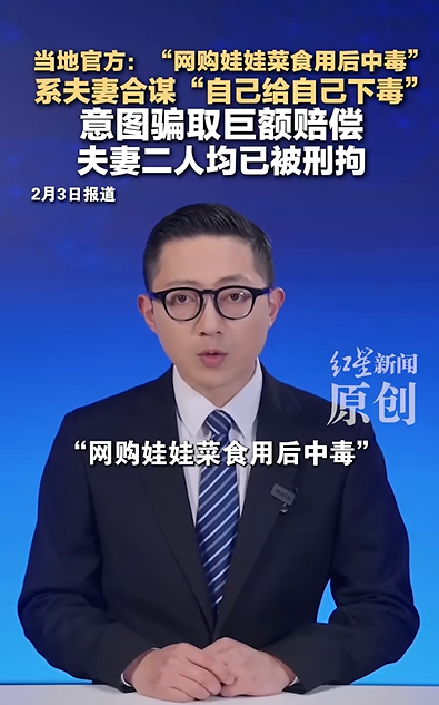 19時,“紅星新聞”微信公眾號發(fā)布消息稱,記者從浙江臺州天臺縣相關(guān)官方人士處進一步了解到,警方在進一步偵查過程中發(fā)現(xiàn),丈夫的下毒行為系夫妻雙方共謀,兩人試圖通過網(wǎng)購娃娃菜食用后制造中毒跡象,以此要挾,向平臺或商家騙取巨額賠償。但最終被警方偵查識破。該人士指出,“他其實不是給他老婆下毒”,夫妻二人為了騙取錢財“自己給自己下毒”。目前,楊女士、陳某波均已被刑拘。網(wǎng)民對此普遍表示震驚與譴責,稱其“手段太狠”“不惜拿生命做賭注,上演現(xiàn)實版苦肉計”,并認為二人被處罰是“自食惡果”。