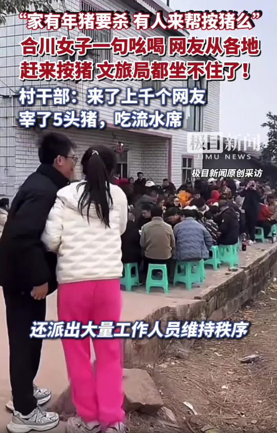 1月9日凌晨,來(lái)自重慶合川的抖音博主“呆呆”發(fā)視頻稱(chēng),1月11日家中要?dú)深^豬,因?yàn)楦改改挲g大了按不住,希望有人幫忙按豬,將請(qǐng)吃刨豬湯答謝,“呆呆”還開(kāi)玩笑稱(chēng)“就想家門(mén)口停滿(mǎn)車(chē),在村里揚(yáng)眉吐氣一回”。短短兩日,視頻點(diǎn)贊量突破18萬(wàn),轉(zhuǎn)發(fā)量超14萬(wàn),“呆呆”建立的6個(gè)500人的“刨豬湯”群很快滿(mǎn)員。盡管“呆呆”連夜采購(gòu)食材并報(bào)備派出所,但已無(wú)法阻止網(wǎng)民熱情。1月10日凌晨,合川文旅緊急抽調(diào)工作人員趕赴現(xiàn)場(chǎng),協(xié)助保障活動(dòng)順利進(jìn)行。1月11日,來(lái)自全國(guó)各地超4000名網(wǎng)民匯聚“呆呆”家鄉(xiāng),其中不乏“鹵鵝哥”等知名網(wǎng)紅。1月11日至12日,“呆呆”連開(kāi)多場(chǎng)直播,邀請(qǐng)網(wǎng)民參加家鄉(xiāng)大聯(lián)歡,直播間觀(guān)看和點(diǎn)贊人數(shù)均超3000萬(wàn)人次。在合川文旅、愛(ài)心企業(yè)、網(wǎng)民等多方贊助下,原計(jì)劃的兩頭豬增至五頭,現(xiàn)場(chǎng)設(shè)五個(gè)分會(huì)場(chǎng)分散人流,公安部門(mén)疏導(dǎo)交通。合川文旅部門(mén)帶著本地特產(chǎn)、景區(qū)門(mén)票到現(xiàn)場(chǎng),講解“刨豬宴”和合川歷史文化,還設(shè)置篝火、煙花、舞龍等環(huán)節(jié)。據(jù)現(xiàn)場(chǎng)網(wǎng)民透露,當(dāng)?shù)匾还矓[了300桌宴席,最多時(shí)同時(shí)有超3000人。該事件引發(fā)熱烈討論,“殺豬女孩呆呆一天漲粉150萬(wàn)”“呆呆殺豬宴一天蒸1000多斤大米”等多個(gè)話(huà)題沖上社交平臺(tái)熱搜。