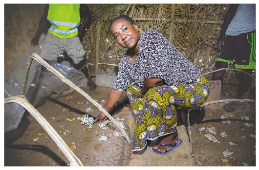 在中非共和國首都班吉附近的大馬拉地區(qū),盛夏7月的午后時(shí)分,太陽熱辣,一間約6平方米、四壁用棕櫚葉遮陰的菇棚里卻幽暗清涼。棚內(nèi)有兩個(gè)長2米、寬1米的畦床,其間星羅棋布地點(diǎn)綴著剛萌出的數(shù)十簇平菇。40歲的法蒂瑪蹲在土埂上,用手撥弄著飽滿的灰白色菌蓋,臉上難掩豐收的喜悅。