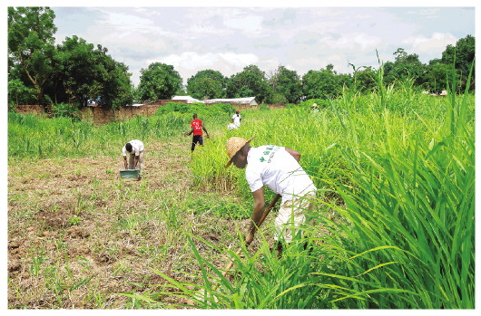 6月1日,在中非共和國首都班吉郊區(qū),當(dāng)?shù)孛癖姺N植菌草。新華社記者羅毓攝
