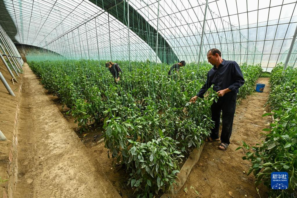 農民在現代設施農業(yè)示范基地物聯(lián)網日光溫室大棚為種植的辣椒整枝。記者 丁磊 攝