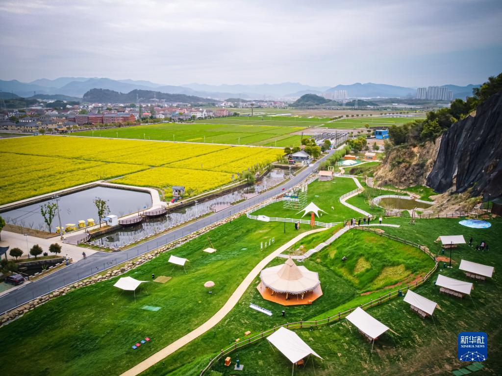 這是3月29日拍攝的諸暨市楓橋鎮(zhèn)杜黃新村用廢棄礦山改造的露營旅游地(無人機照片)。記者 江漢 攝
