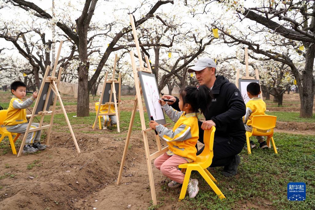 4月2日,老師指導小朋友在臨城縣北程村百年梨園寫生。記者 駱學峰 攝