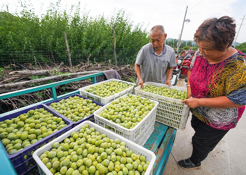 7月6日,山東省鄒平市西董街道南洞村的青李聯(lián)合農場,果農整理采摘的青李。
