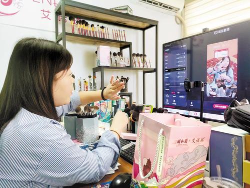 主播苑慧妍正在介紹“艾諾琪”品牌化妝刷 記者 宋平 攝