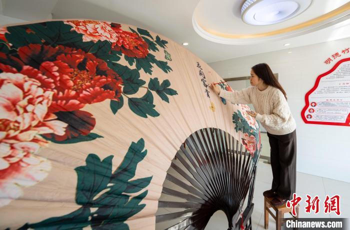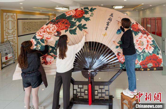 5月14日,工作人員正在專門(mén)定制的長(zhǎng)2米,寬3.8米的大號(hào)竹扇上繪制圖案 王歌 攝