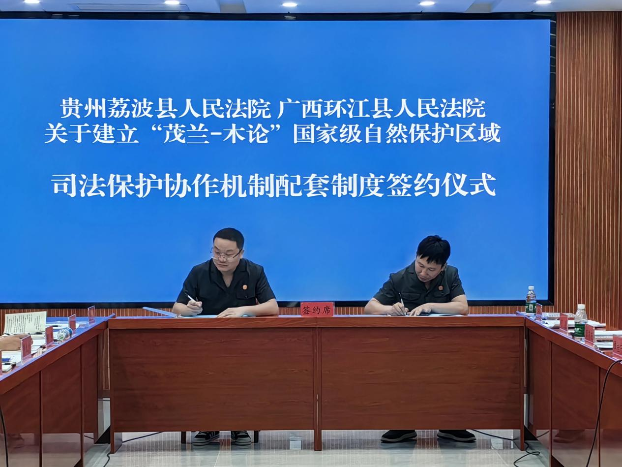 2022年10月,貴州省荔波縣人民法院、廣西環(huán)江毛南族自治縣人民法院在茂蘭法庭共同簽署了《茂蘭-木論國家級自然保護(hù)區(qū)跨區(qū)域司法保護(hù)協(xié)作機(jī)制框架協(xié)議》,拉開了黔桂兩省區(qū)生態(tài)保護(hù)跨區(qū)域司法保護(hù)協(xié)作的序幕。