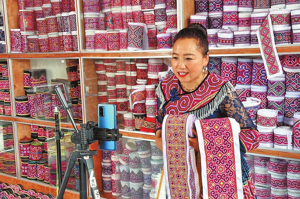 雨后的荷塘邊,趙凱晨身穿壯族傳統(tǒng)服飾,架起手機,擺上水竹花傘,開啟了直播?!皞闵系膱D案是我們壯族的壯錦,有人丁興旺的寓意,送親戚送朋友都很好?!壁w凱晨是丘北縣壯學(xué)會理事長,多年潛心學(xué)習(xí)和研究壯文化,介紹產(chǎn)品時,對民族文化信手拈來,吸引了不少網(wǎng)友觀看。