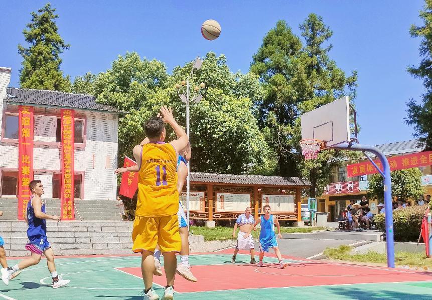 紫溪市鎮(zhèn)樂園村隊(duì)隊(duì)員在搶投3分球 謝助民 攝
